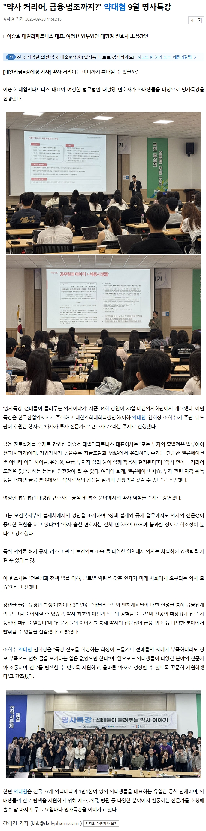 '약사 커리어, 금융·법조까지?' 약대협 9월 명사특강