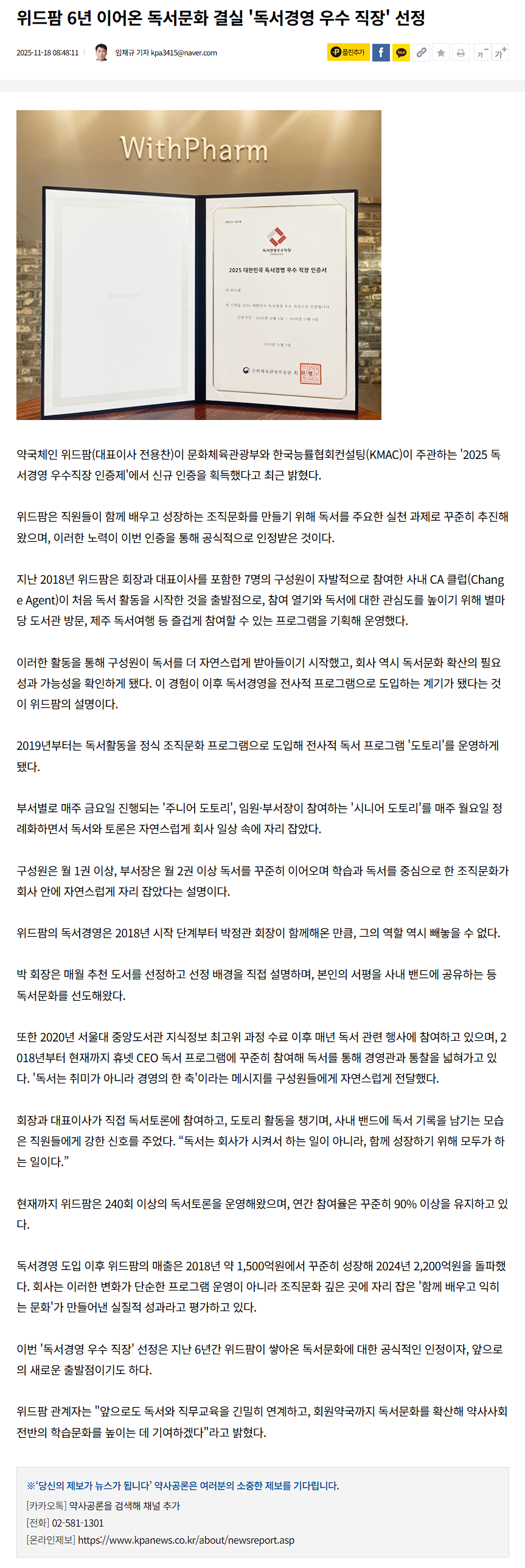 위드팜 6년 이어온 독서문화 결실 '독서경영 우수 직장' 선정